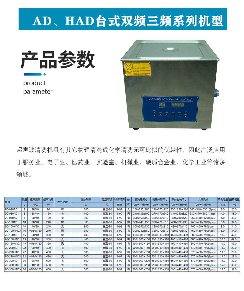 智能型双频/脱气超声波清洗机(型号:ZC-220AD)是一款集成了28KHZ和40KHZ两种工作频率,并具备脱气功能的超声波清洗设备。该设备通过双频率交互工作,结合脱气功能,实现了高效、全面的清洗效果,特别适用于对清洗质量要求较高的场合。