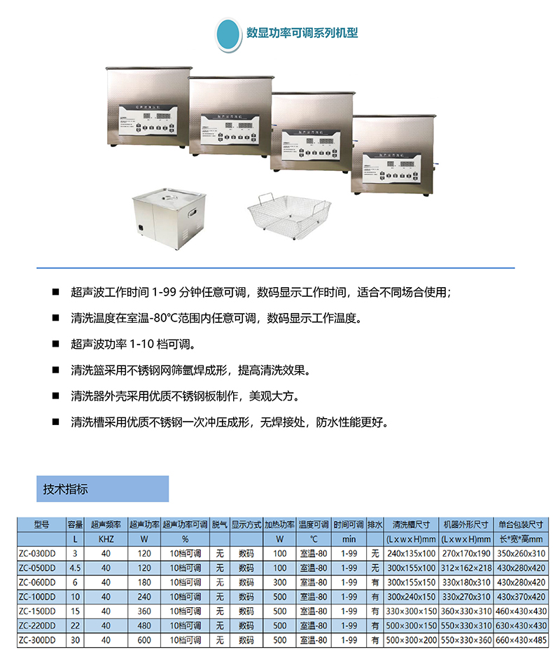 桌面型数码控制清洗机,具备时间、温度、超声功率可调功能,适用于实验室、医院、电子车间等多种场合,能够满足不同物品的清洗需求。