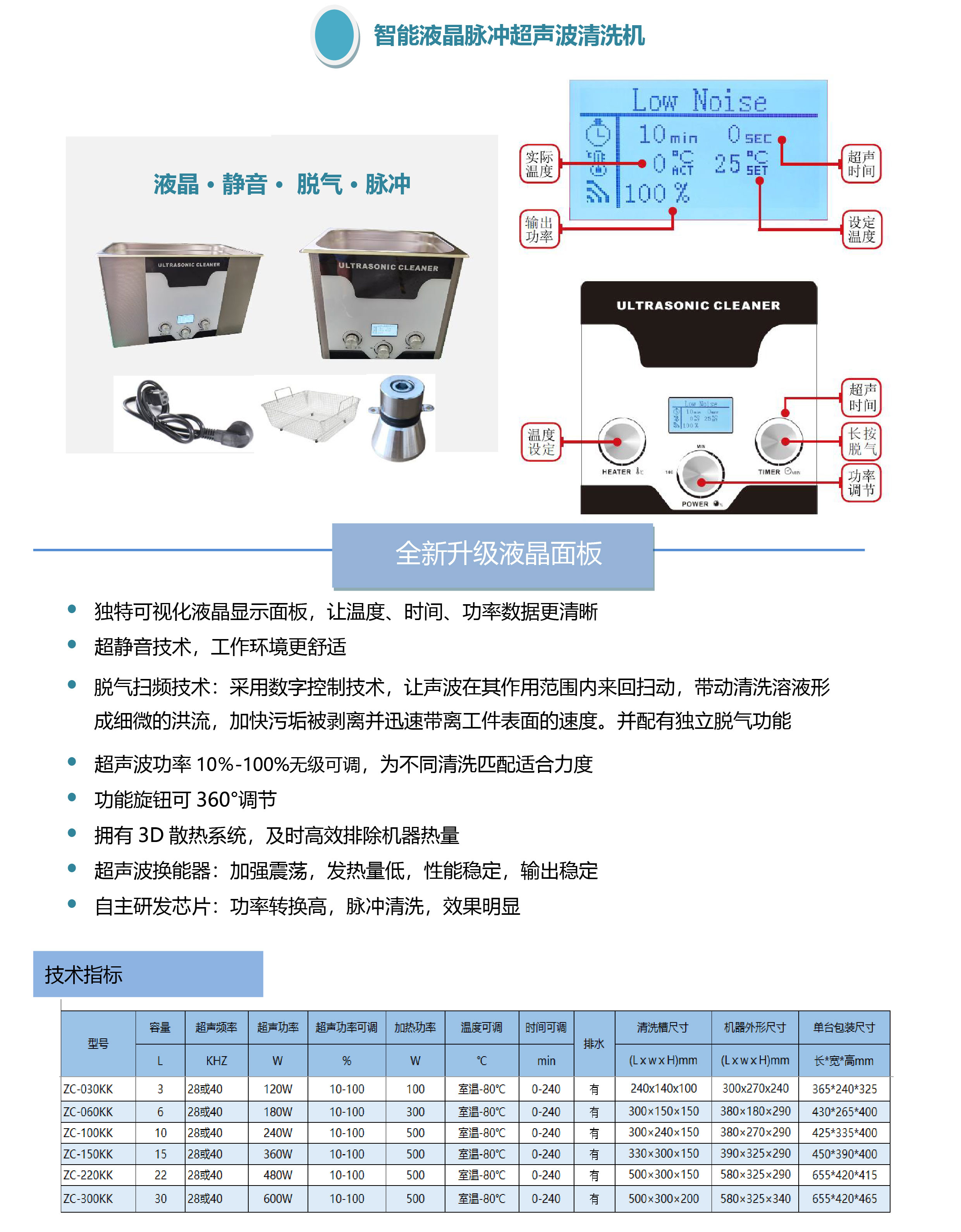 的桌面型超声波清洗机,适用于实验室、电子车间、珠宝加工、医疗器械等领域的小型精密部件清洗。通过超声波脉冲技术与液晶智能控制系统的结合,实现清洗过程的精准化与可视化,提升清洗效率与效果。